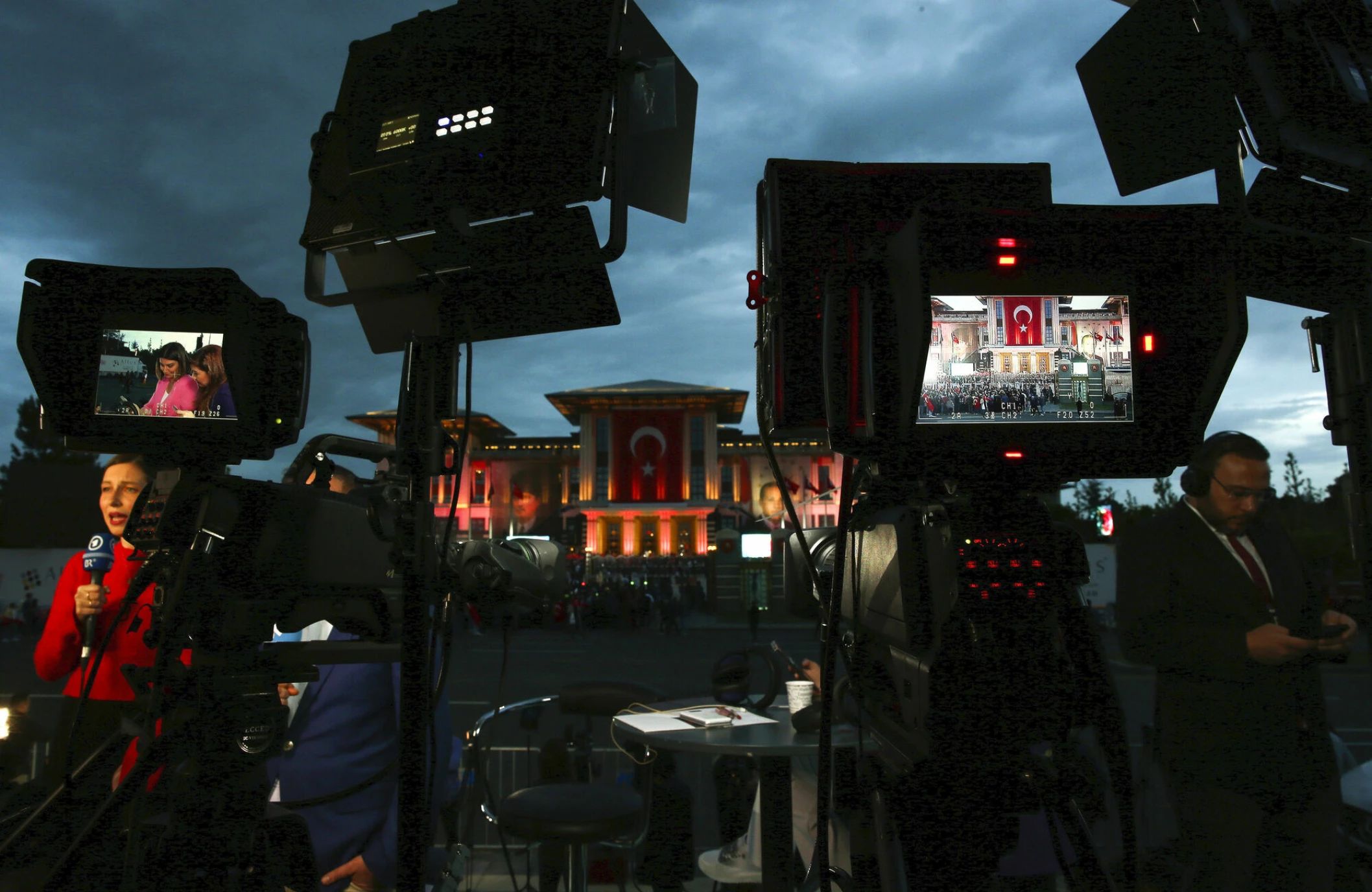 Journalister utenfor presidentpalasset. foto: Ali Unal / AP / NTB (Hentet fra Journalisten)
